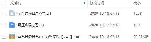 本资源为《富爸爸穷爸爸:百万财商课》百度云网盘资源分享下载,具体看下文目录,格式为M4A/65.51MB。本资源已做压缩包防和谐处理,请勿直接在百度网盘中和谐资源用不了,下载到本地之后解压在观看。