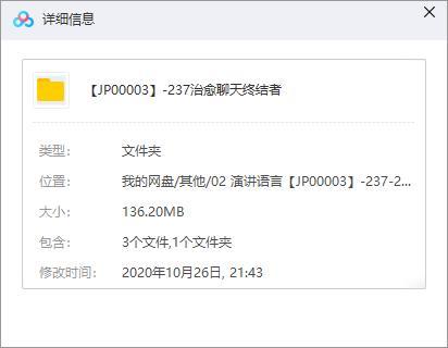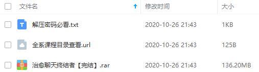 本资源为《治愈聊天终结者》百度云网盘资源分享下载[MP3/136.20MB],具体看下文目录。本资源已做压缩包防和谐处理,请勿直接在百度网盘中和谐资源用不了,下载到本地之后解压在观看。