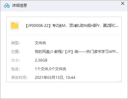 本资源为《专治迷茫,顶级教练助你规划职业,赢在职场》视频MP4百度云网盘下载[2.36GB],具体看下文目录。本资源已做7Z压缩包防和谐处理,下载到电脑之后解压再观看。