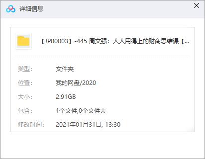 本资源为《周文强:人人用得上的财商思维课》视频课程百度云网盘下载[MP4/2.91GB],具体看下文目录。本资源已做7Z压缩包防和谐处理,下载到电脑之后解压再观看。