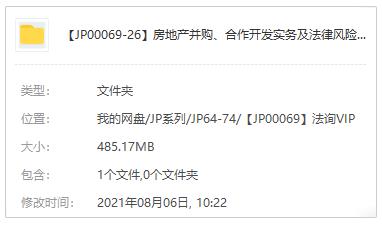 本资源为房地产企业并购合作相关法律税收课程网盘分享下载,大小为485.17MB,7做压缩,下载解压后学习!