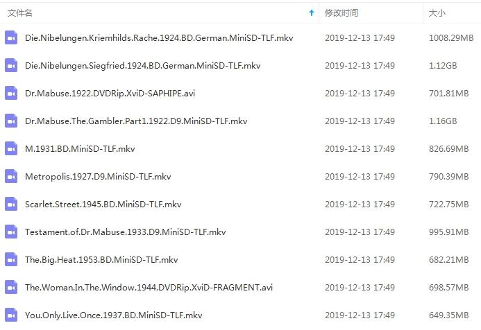 西德弗里茨朗导演黑白无声电影11部(1922-1953)合集[AVI/MKV/9.19GB]百度云网盘下载,一共包含从1922年到1953年期间弗里茨朗导演的电影11部,均为黑白无声电影,支持网盘在线观看,资源大小9.19GB。