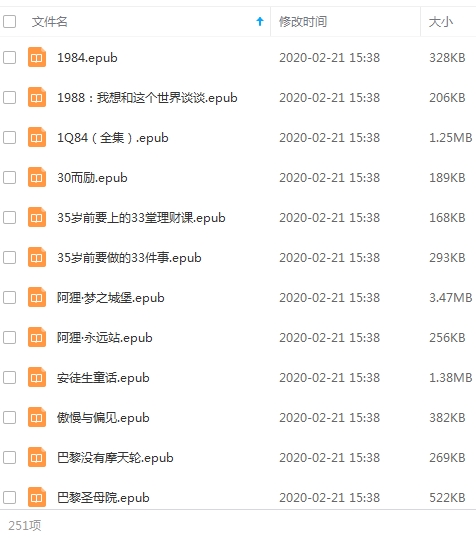 本资源为《豆瓣图书畅销榜top250》电子书百度云网盘下载,收录251本,格式为epub,资源大小387.83MB,分卷压缩包资源,需要下载后解压观看,具体目录见下文。
