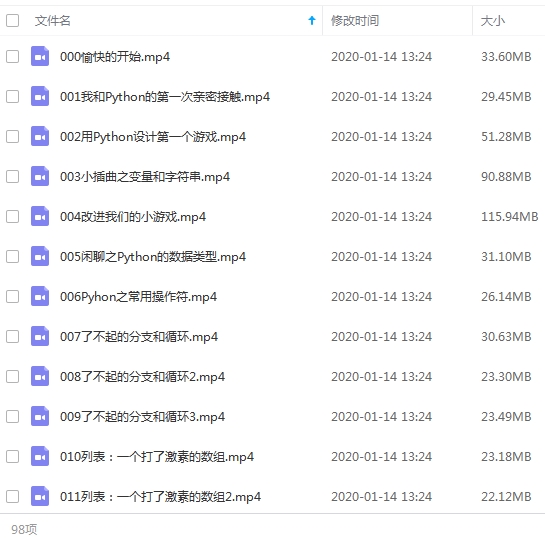 Python视频教程《零基础入门学习到精通》全96集视频合集[MP4/5.69GB]百度云网盘下载,一共包含Python视频教程96集,视频格式为MP4,支持网盘在线观看,资源大小5.69GB。