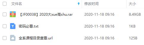 本资源为《2020大学高数视频教程》百度云网盘资源分享下载[MP4/8.49GB],具体看下文目录。本资源已做压缩包防和谐处理,请勿直接在百度网盘中和谐资源用不了,下载到电脑之后解压在观看。