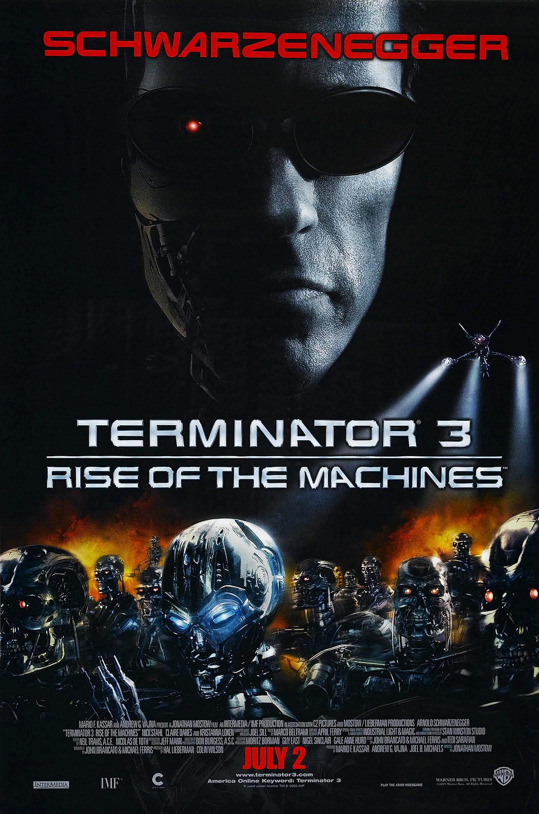 同时,美国的电脑系统遭受了病毒入侵,人类对此束手无策,只能准备启用“天网”,一旦“天网”接管美国军方防御系统,人类将首当其冲的被消灭。面对已经发生的未来,John Connor和Kate Brewster决定奋起反抗。在T-850的帮助下,他们将又一次改变人类的命运。10年过去了,电影《终结者2》的续集再次揭示了未来的命运。John Connor(由Nick Stahl扮演),已经成为一个22岁的年轻人,他在母亲的去世之后,过着隐姓埋名的生活,对于即将到来的命运没有兴趣面对。然而,命运并未按照他的意愿进行,“天网”在经历了两次失败之后,派出了更先进的T-X终结者(由Kristanna Loken扮演)来追杀他。同时,人类也启动了T-800改良后的终结者T-850(由Arnold Schwarzenegger扮演)来保护John。