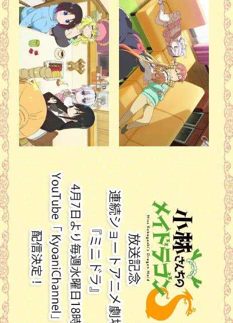 京都动画将在7月推出一部全新的京阿尼TV动画——《小林家的龙女仆S》。为了为第二季造势,我们从4月7日起将在YouTube的KyoaniChannel频道播放一部全新的短篇动画——《ミニドラ》。这部动画将为大家提前揭开更多关于龙女仆的故事,同时也会让大家更加期待即将到来的第二季。